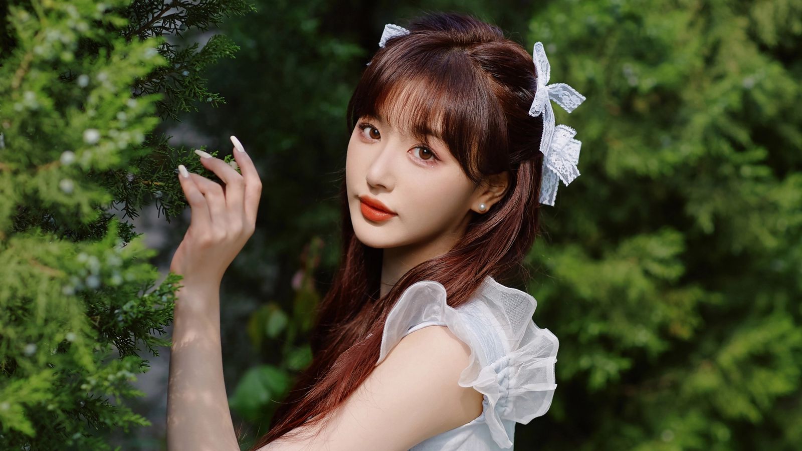 她光彩夺人、亭亭玉立,把两个汉子看呆。