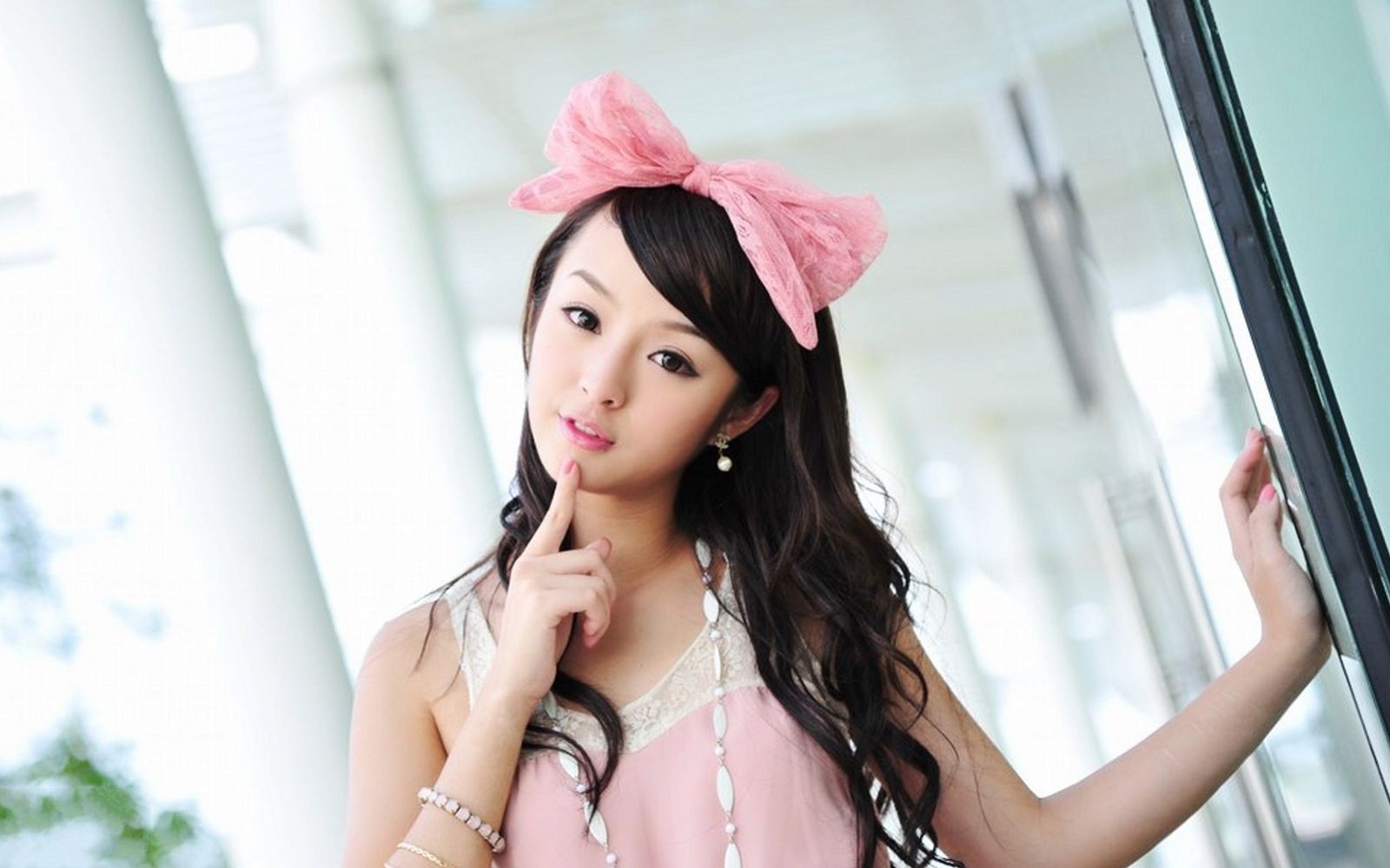 上挽双鬟望仙髻,钗环迭置,耳畔点缀一对赤金流珠耳坠,妆容清雅,眉心一点粉色花钿,衬得面如芙蓉。