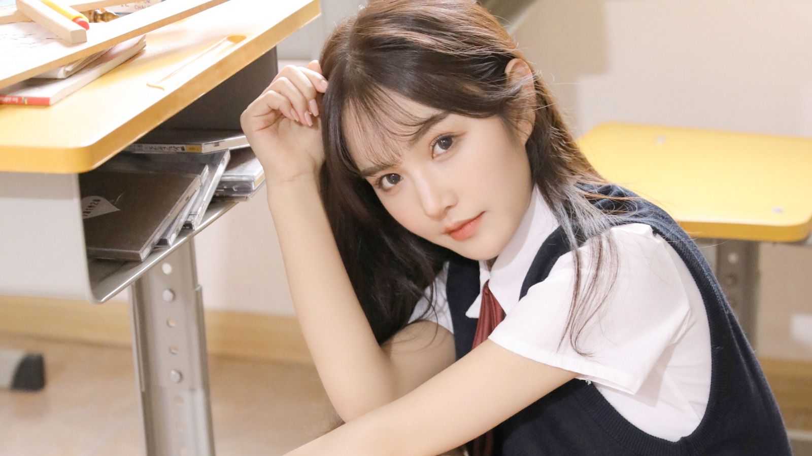 肉色的丝袜裹住修长的双腿,搭配黑色高跟鞋,白皙的脚踝若隐若现,连紧闭的圆润双膝都散发着让人无法移开视线的诱惑。