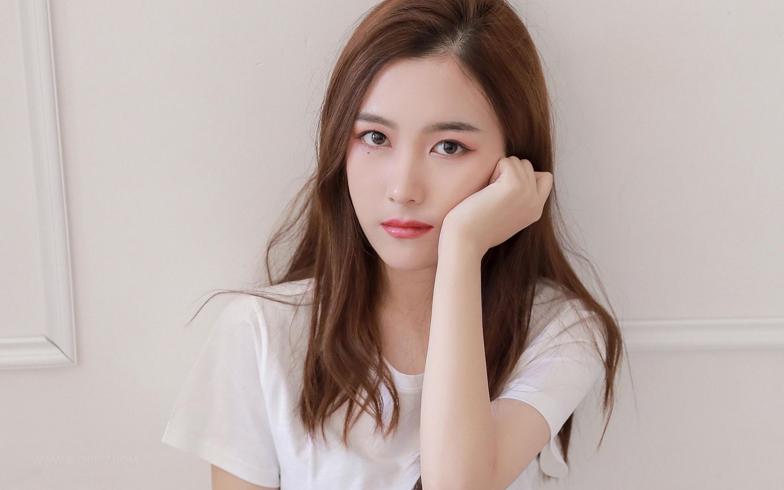 她穿着一件白色的雪纺衬衫和深蓝色的包臀裙,优雅的气质中又带着几分干练。那张被岁月善待的面庞依然如少女般光洁白皙,眉眼间透露出几分冷峻。长发柔顺地披散在肩头,随着她低头的动作轻轻晃动。