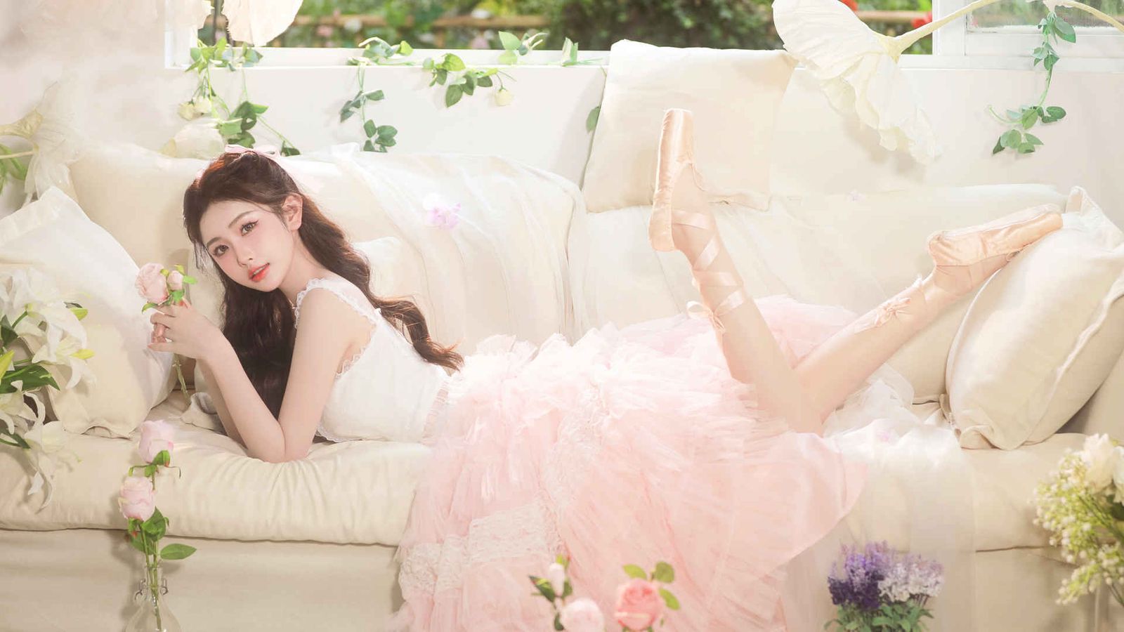 她双颊绯红如霞,杏眼迷蒙含泪,红唇被吻得微微红肿,水光潋滟,几缕发丝凌乱地贴在汗湿的额角和颈边,整个人透着一股被狠狠蹂躏过的、惊心动魄的媚态。