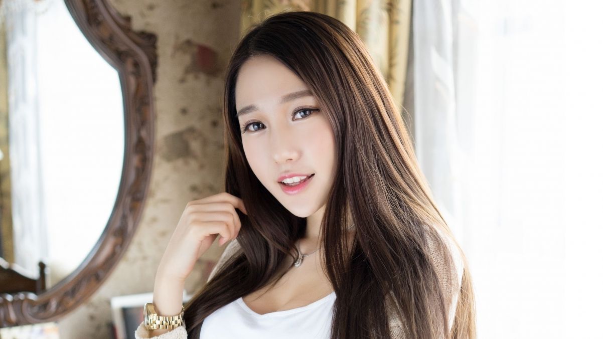 乌黑的长发披散双肩,穿着长到膝盖的白色印花裙子,规规矩矩地站在那儿,亭亭玉立,叫人舍不得移开眼。