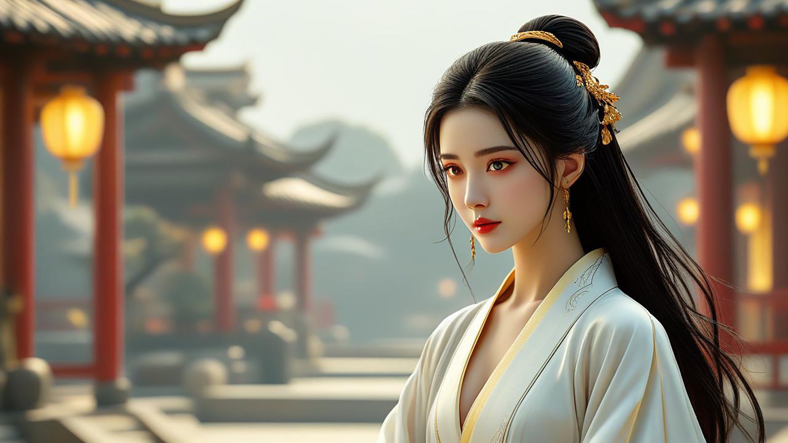 峨眉清秀,双眸清冷,琼鼻高挺,银丝如瀑,着一身素雪白衣,缀几朵白梅,一条彩带绕于细柳腰又缠于双手,高贵典雅,白玉无瑕。