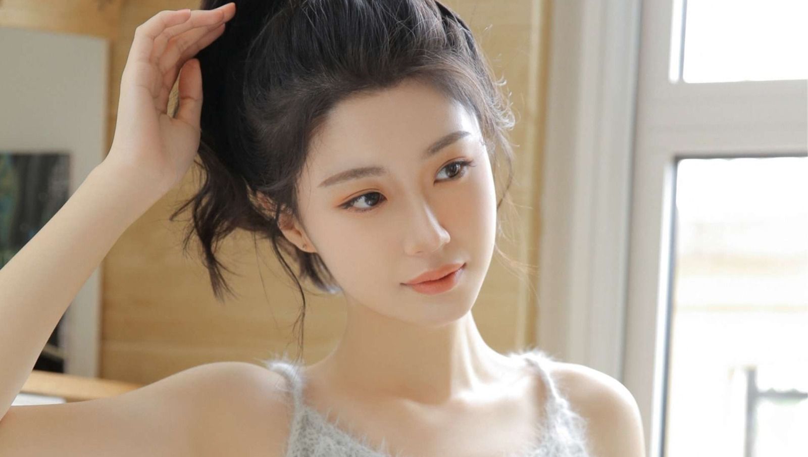 她的脸上没有笑容,眼神慵懒而迷离,嘴唇涂着淡淡的粉色唇膏。
