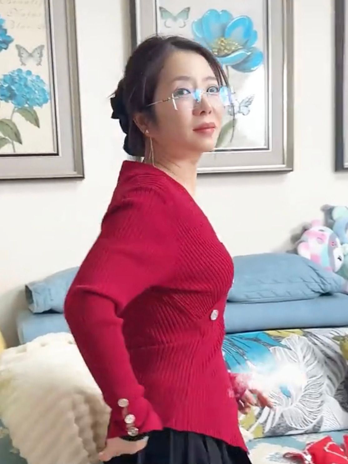 同样的角度,下一个视频切换了,估计是删除了中间的过程。百合依然在窗前,穿着连体睡衣,只是这次她侧对着镜头,左腿站着,右腿跪在窗前的椅子上。老A依然在身后揉捏百合,百合一边时不时局促地用手遮挡,一边紧张地半回头低头看老A的动作。老A现在只穿着一件T恤和一条内裤,原来的长裤不知道扔到哪里去了。老A双手伸进百合的睡裙,在腰两边摸索着,应该找到了百合内裤的裤腰,向下用力,就在百合惊慌失措时,从睡裙裙摆处褪出了她的白色的内裤。老A右手一把搂住百合,让她不要转身,左手很快就把百合的内裤先从右腿、再从左腿上褪下,揉捏成一团,顺手抛到了镜头外的床上。